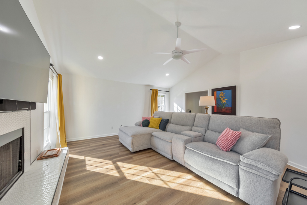 Welcome to this beautifully maintained and thoughtfully upgraded 5 bedroom, 2 bathroom home in the sought-after Valley Brook community, perfectly situated in the heart of Woodstock. A charming covered front porch sets the tone as you step inside to a bright fireside family room featuring vaulted ceilings and an abundance of natural light. The family room flows seamlessly into the separate dining room highlighted by elegant bay windows. The updated kitchen boasts newer appliances—including a gas range—stone countertops, and ample cabinet space. The main-level primary suite offers vaulted ceilings, an updated ensuite bathroom with double vanities and a sleek glass shower, plus private access to the back deck. Two generously sized secondary bedrooms on the main level share a full hall bathroom, and a convenient laundry closet completes the floor. The fully finished basement expands the possibilities with 2 additional bedrooms, extensive storage, walkout access to the backyard, and entry to the 2-car garage. Relax or entertain on the rear deck overlooking the spacious backyard greenspace. Situated on a generous 0.65-acre lot with no HOA, this home offers both privacy and convenience. Enjoy easy access to Downtown Woodstock, Downtown Canton, I-575, and a wide array of shopping, dining, and entertainment options. This is Woodstock living at its best!