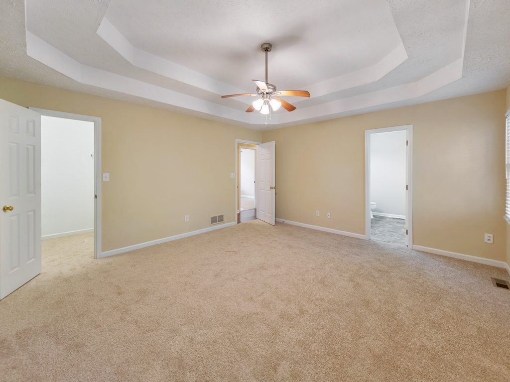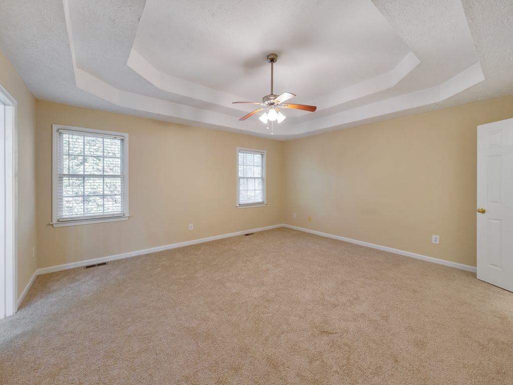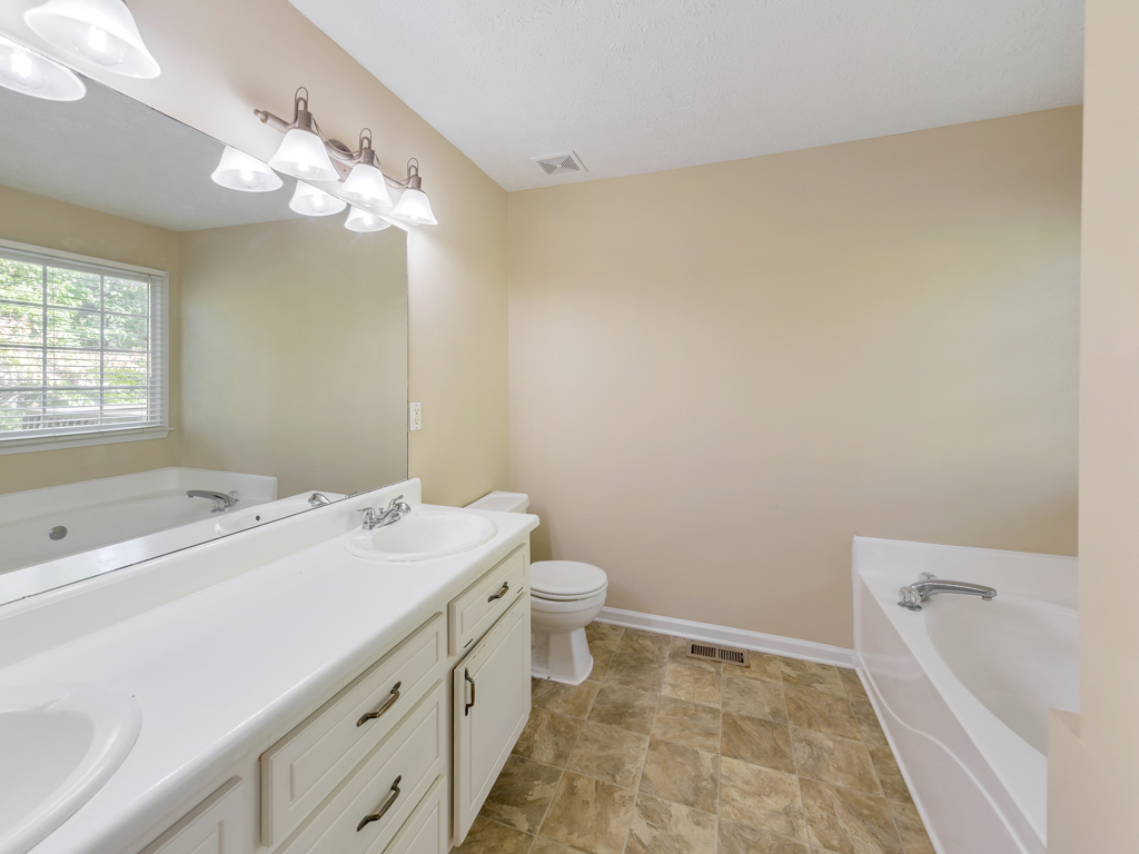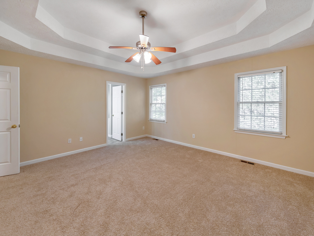 Welcome to this charming 4 bedroom, 3 bathroom home nestled on a peaceful wooded cul-de-sac lot in the desirable Queensbury Orchard community in the heart of Acworth. New (2024) roof, carpet and paint throughout! Set on almost half an acre, this home combines comfort, privacy, and convenience in one inviting package. Relax on the cozy covered front porch before stepping inside to the fireside family room featuring vaulted ceilings and a warm, open feel. The separate dining room flows seamlessly to the bright kitchen, complete with white cabinets and direct access to the back deck—perfect for entertaining or enjoying quiet mornings outdoors. The primary bedroom on the main level boasts tray ceilings, a walk-in closet, and an ensuite bathroom with double vanities, a soaking tub, and a separate shower. Two spacious secondary bedrooms and a full hall bath complete the main level, along with a conveniently located laundry closet. The lower level offers a large bonus room or fourth bedroom with its own full bathroom, ideal for guests, a home office, or a media space. Outdoor living is a highlight here, with both an open-air deck on the main level and a covered deck below overlooking the tranquil, wooded backyard. Located in the sought-after Etowah High School district, this home offers no HOA and easy access to Downtown Acworth, Downtown Woodstock, Lake Allatoona, and a variety of shopping and dining options. You don't want to miss this one!