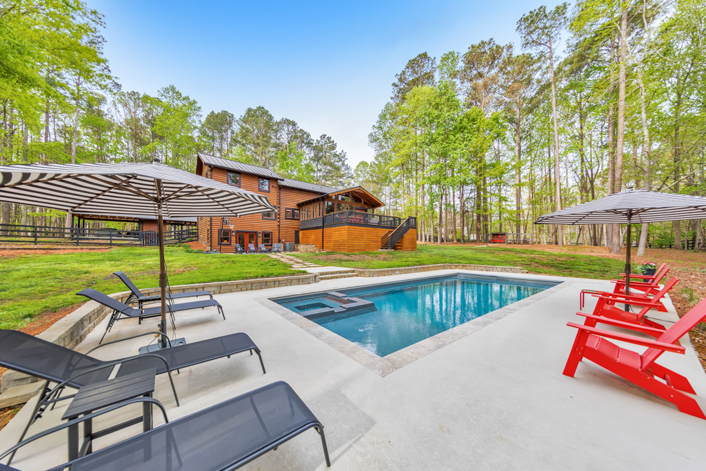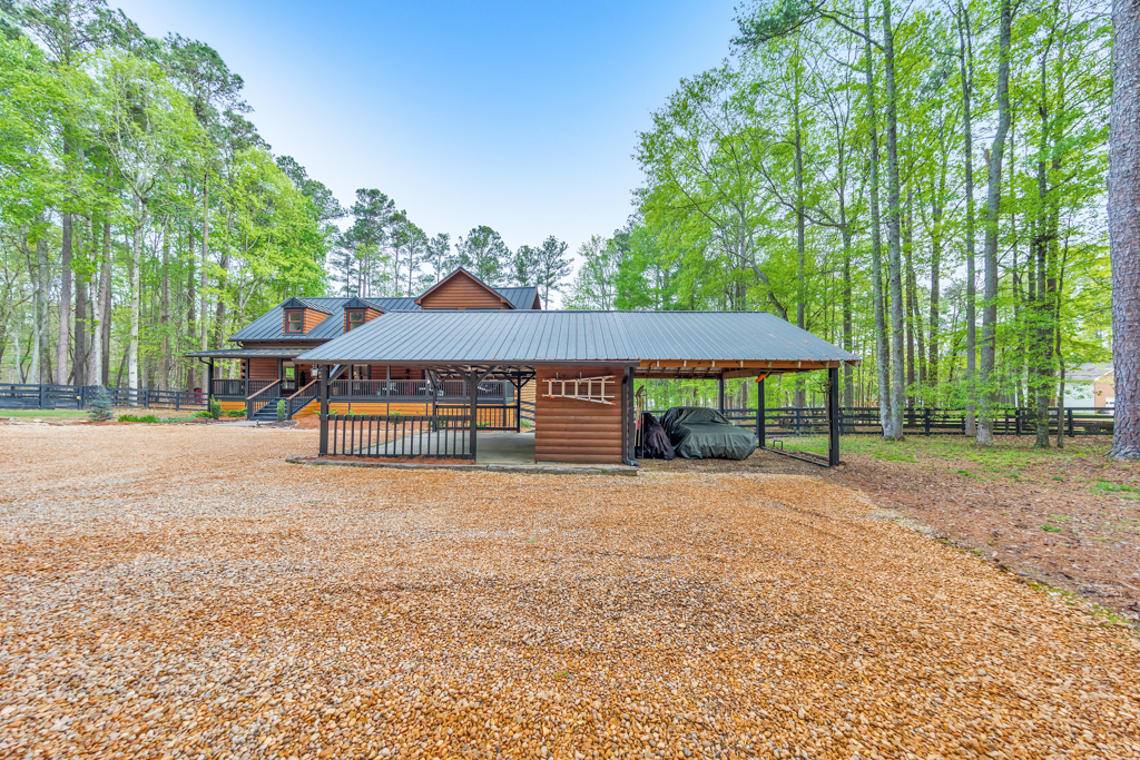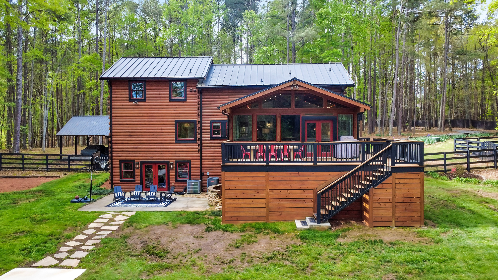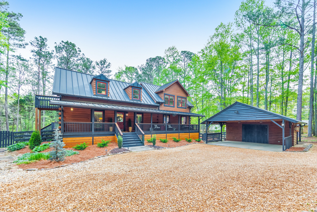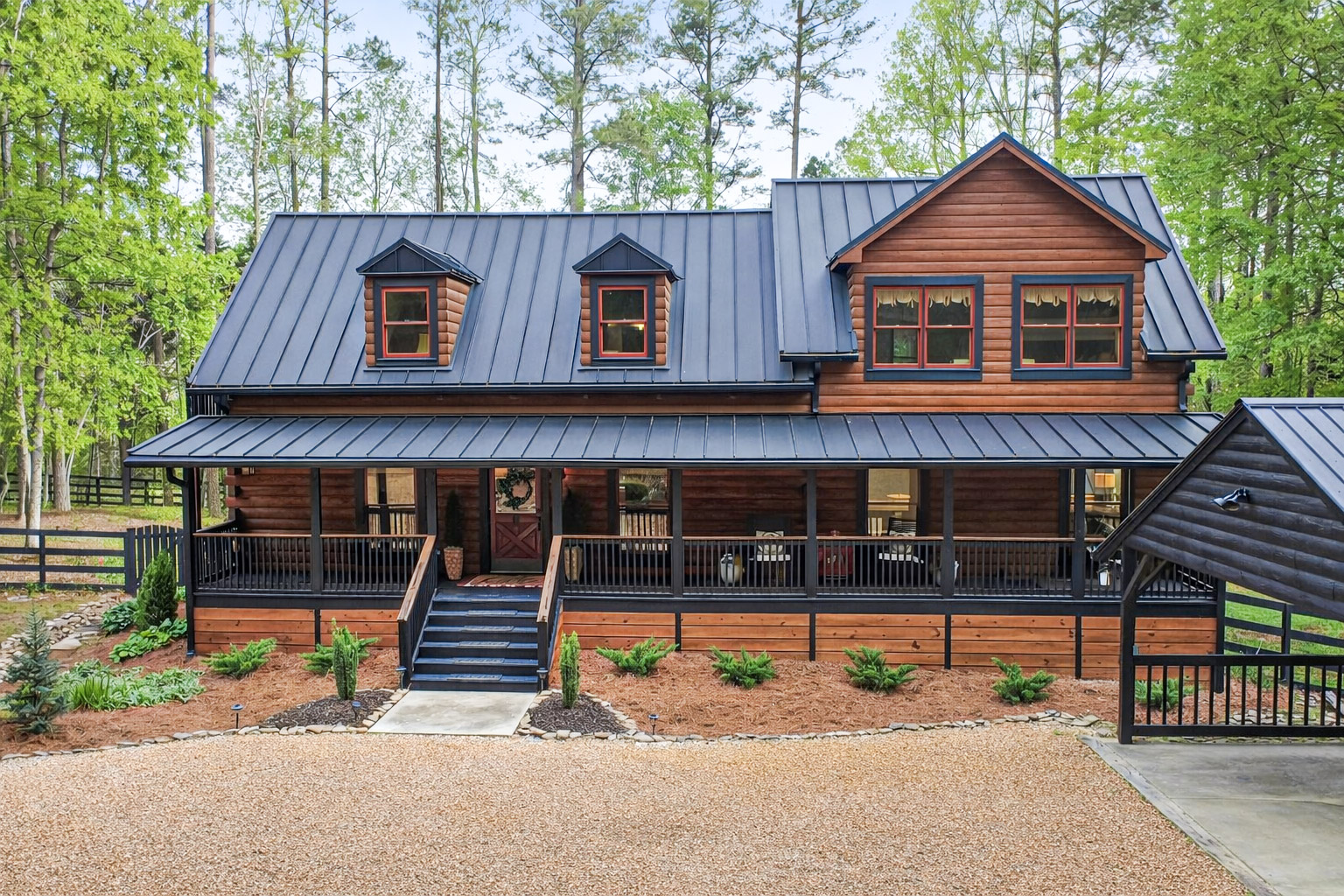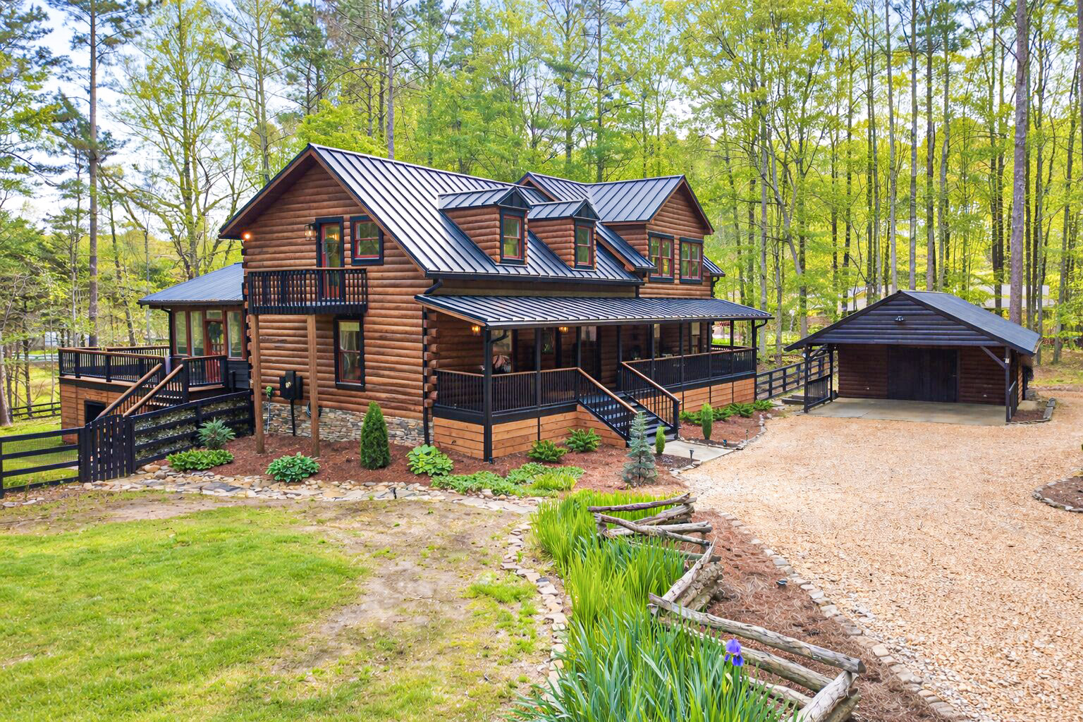 Welcome to your private retreat—where tranquility meets modern luxury. Nestled on 3.31 acres of beautifully wooded land, this completely renovated 4 bed / 3.5 bath D-log cabin offers the perfect balance of peaceful seclusion and everyday convenience, just minutes from shopping, dining, and top-rated schools. As you travel down the long gravel drive, you’ll feel transported into your own serene escape. Surrounded by mature trees and lush landscape, the home sits gracefully in a spacious clearing, offering unmatched privacy. A charming full-length front porch invites you to relax and take in the quiet beauty of the property, while a spacious patio and brand-new back deck provide ideal spaces for outdoor entertaining. Inside, the home has been thoughtfully transformed with extensive upgrades throughout. The main level and basement feature brand-new LVP flooring, complemented by carpet and tile in select areas, along with fresh lighting, recessed lighting, and ceiling fans that enhance every space. Vaulted ceilings and custom bookcases add character and charm. The stunning kitchen has been completely reimagined and is a true showstopper—featuring stone countertops, a large island with breakfast bar seating, and an eat-in kitchen layout. Upgrades include a custom pantry with built-in cabinetry and doors, stylish backsplash, industrial gas range with vent hood, new dishwasher, and refrigerator—perfect for both everyday living and entertaining. The inviting living room showcases a striking rock fireplace, creating a warm and welcoming focal point. Additional living spaces include a formal dining room, den, exercise room, and a fully finished basement—offering flexibility for every lifestyle. All 3 full bathrooms and 1 half bath have been beautifully renovated with new tile, vanities, and modern fixtures. The spacious owner’s suite is a true sanctuary, featuring walk-in closets with motion-sensor lighting, custom built-ins, a double vanity, a relaxing soaking tub, and a separate tiled shower. Upstairs, you’ll find two bedrooms with new carpet, a large bonus room, balcony access, and a full bath with double vanity. The fully finished walk-out basement with interior entry provides incredible versatility, complete with a built-in entertainment area featuring custom cabinetry and granite countertops, an additional bedroom space, full bath, and a conveniently located lower-level laundry area. Step outside and experience resort-style living. The private backyard oasis features a 35-foot heated fiberglass pool with automatic cover, along with a fenced raised garden area with 8 beds—perfect for gardening enthusiasts. The property also includes space for hobby farming, with areas for chickens. Additional exterior upgrades include a freshly restained home with a painted roof, new rock driveway, custom mailbox, double-sided carport, and enclosed workshop/storage space. This one-of-a-kind property offers the rare opportunity to enjoy peaceful country living with modern upgrades already in place. Whether you're looking for a full-time residence, weekend escape, or hobby farm, this home truly has it all.