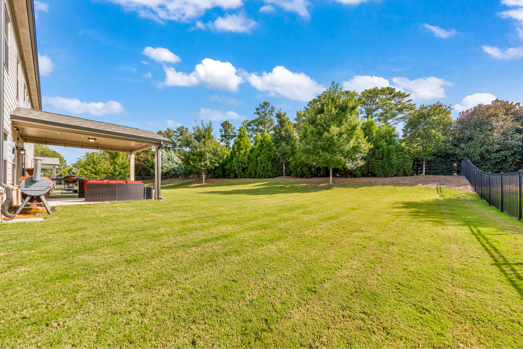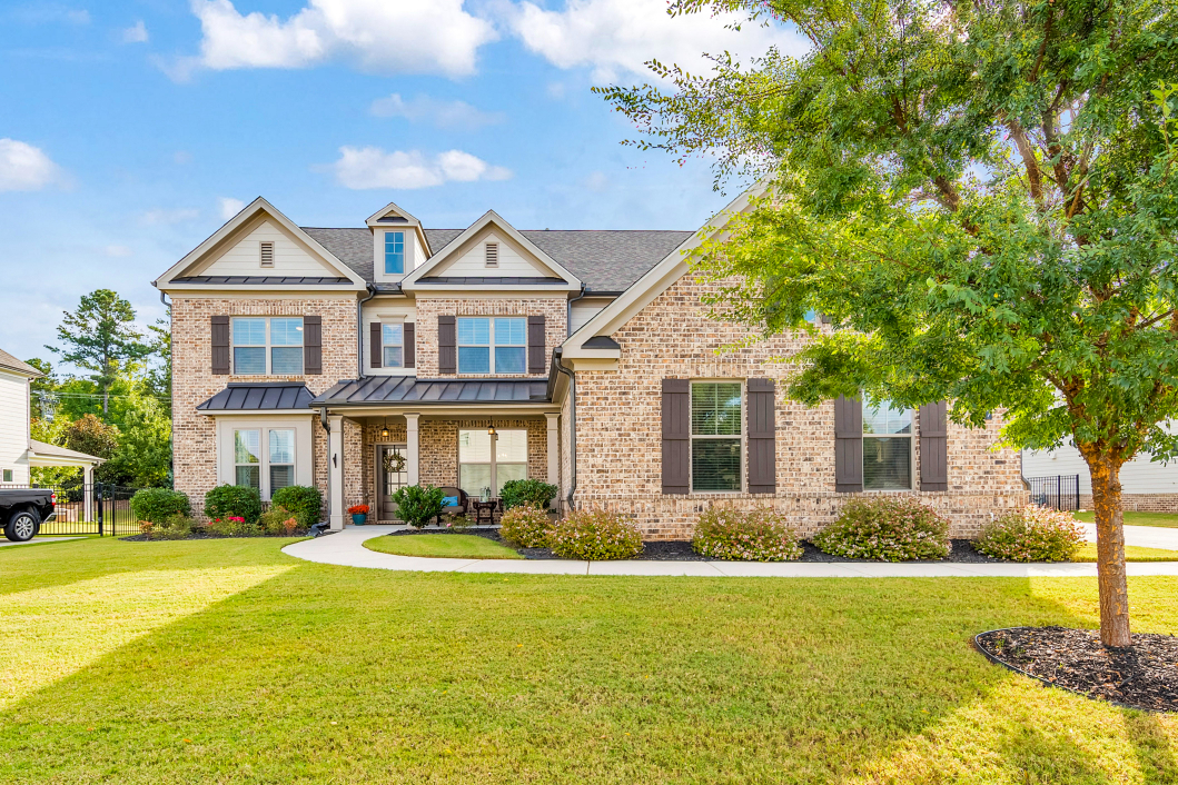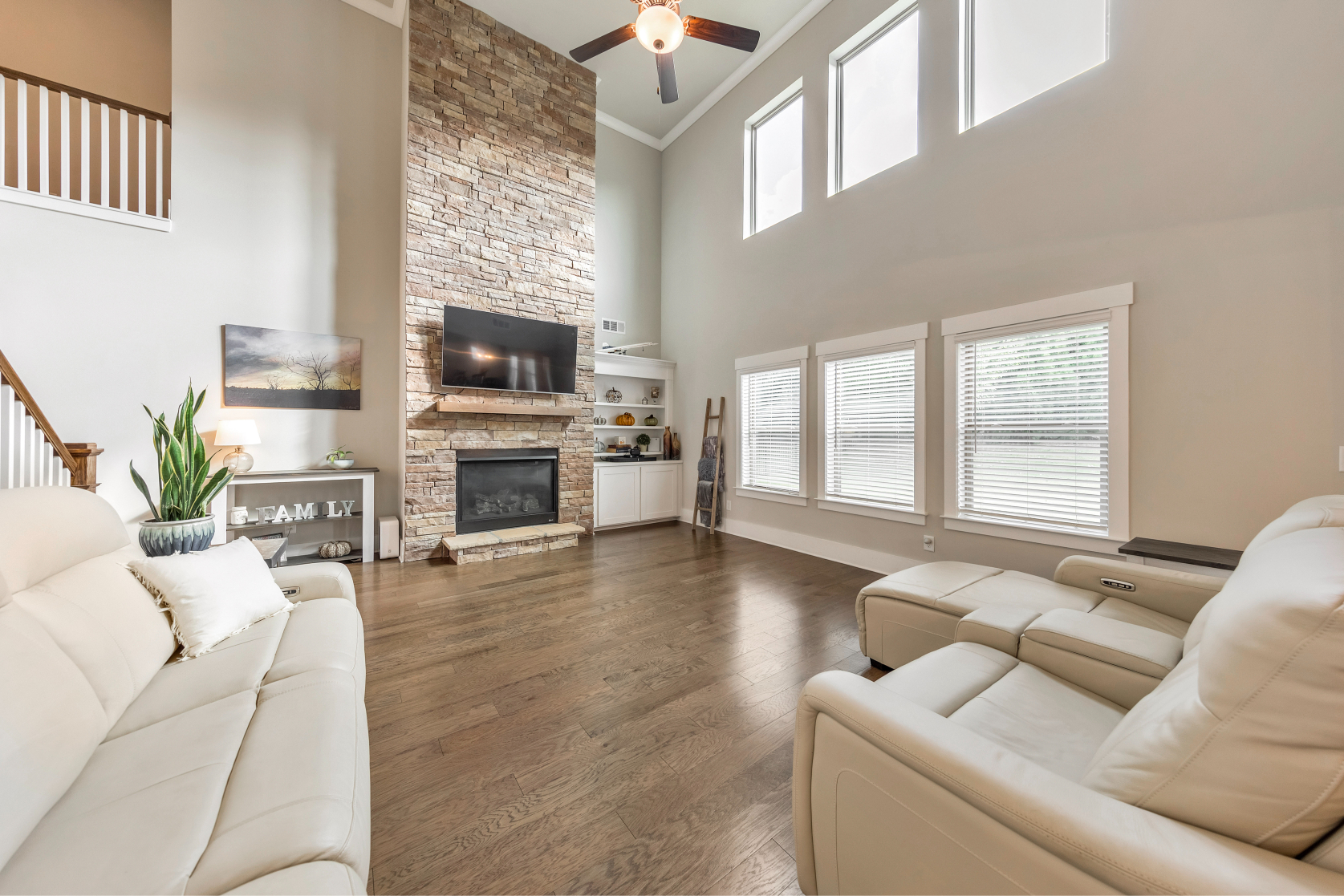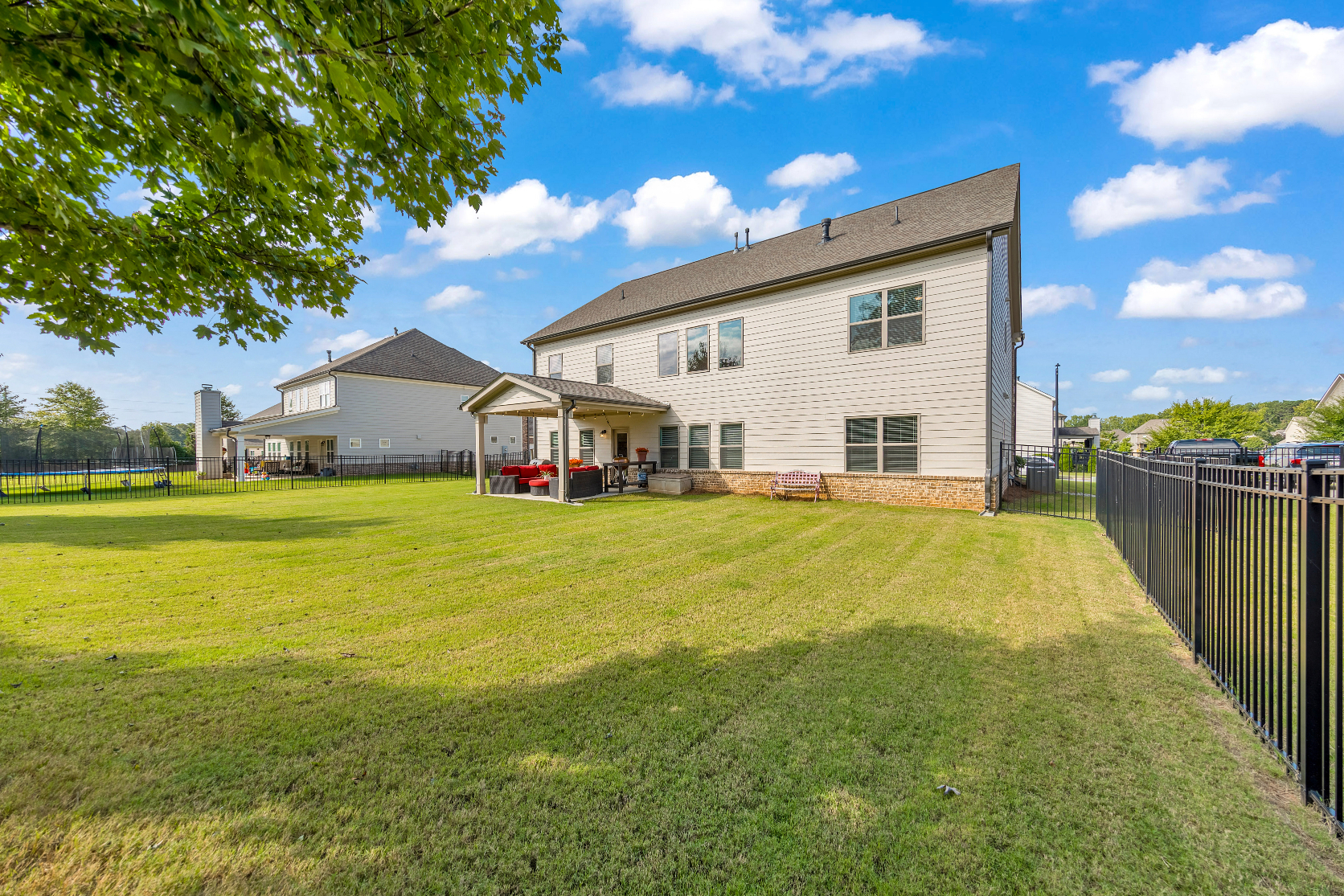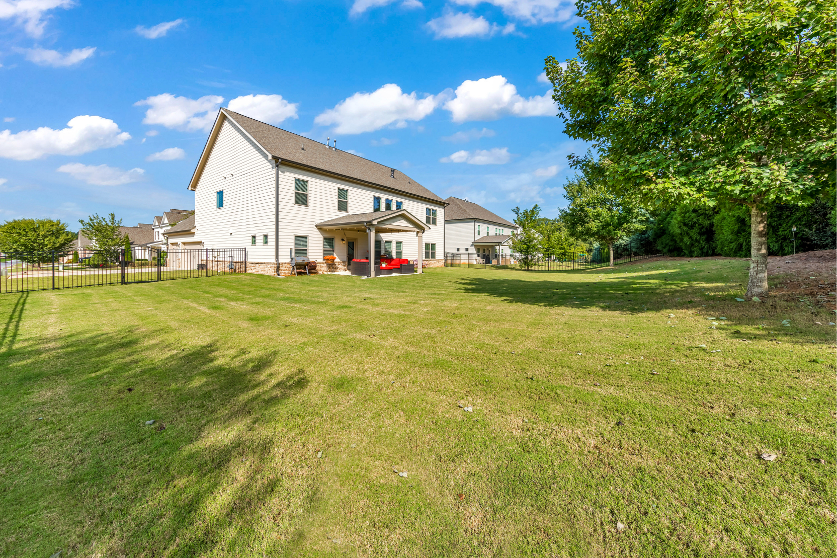 This timeless beauty is ready for you to move right in! Welcome to this stunning 5 bed / 4.5 home built in 2019 that blends modern comfort with elegant design. From the moment you step inside, the open floor plan creates a bright and inviting atmosphere, perfectly suited for both everyday living and entertaining. The gourmet kitchen is a chef’s dream, complete with double ovens, a gas cooktop, vent hood, granite countertops, stainless steel appliances, and white soft-close cabinetry that offers both style and functionality. A breakfast bar and eat-in dining space overlook the two-story great room, where a floor-to-ceiling stone fireplace and a wall of windows flood the home with natural light. The main level also features a formal dining room ideal for hosting dinner parties, a private office with French doors for working from home, and a guest suite with a full ensuite bath. A powder room adds convenience for guests, while detailed trim and thoughtful finishes elevate the character throughout. Hardwood floors extend across the main living areas. Upstairs, the primary suite serves as a true retreat with tray ceilings and a spa-like bath that includes a double vanity, soaking tub, a separate glass-enclosed shower, and an oversized walk-in closet.Secondary bedrooms include a Jack & Jill bath shared between two rooms and an additional bedroom with its own ensuite bath. The laundry room is also conveniently located on the upper level. All bathrooms feature granite countertops and timeless tile finishes. Step outside to the covered patio, the perfect outdoor oasis for relaxing or watching sunsets with family and friends. The three-car garage provides ample parking and storage. This home is nestled in a beautiful neighborhood that offers a scenic lake with a path, providing a peaceful backdrop for evening strolls. Located within award-winning school districts, this home combines luxury living, modern convenience, and an unbeatable setting. Don’t miss the opportunity to make this exceptional property your own.
