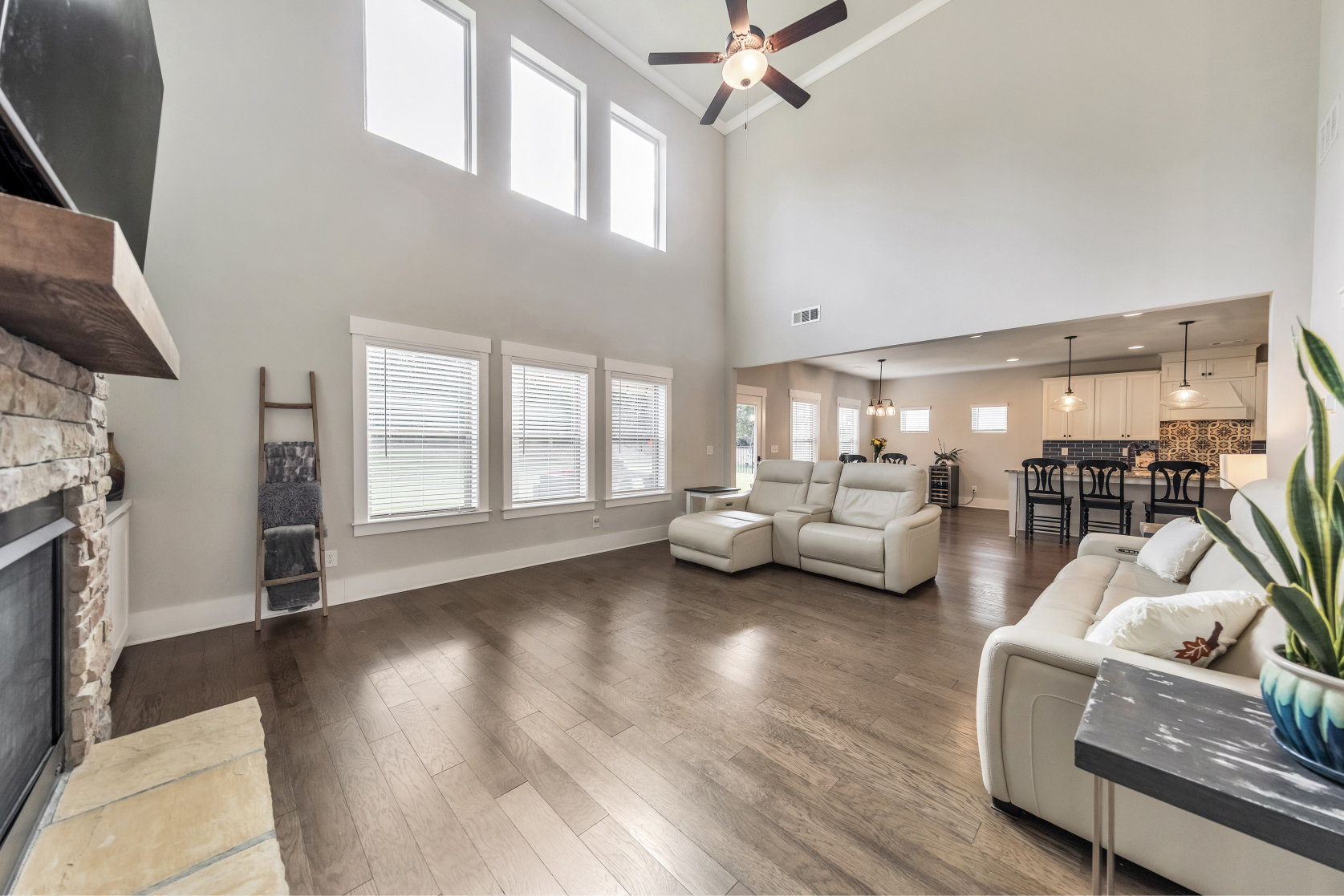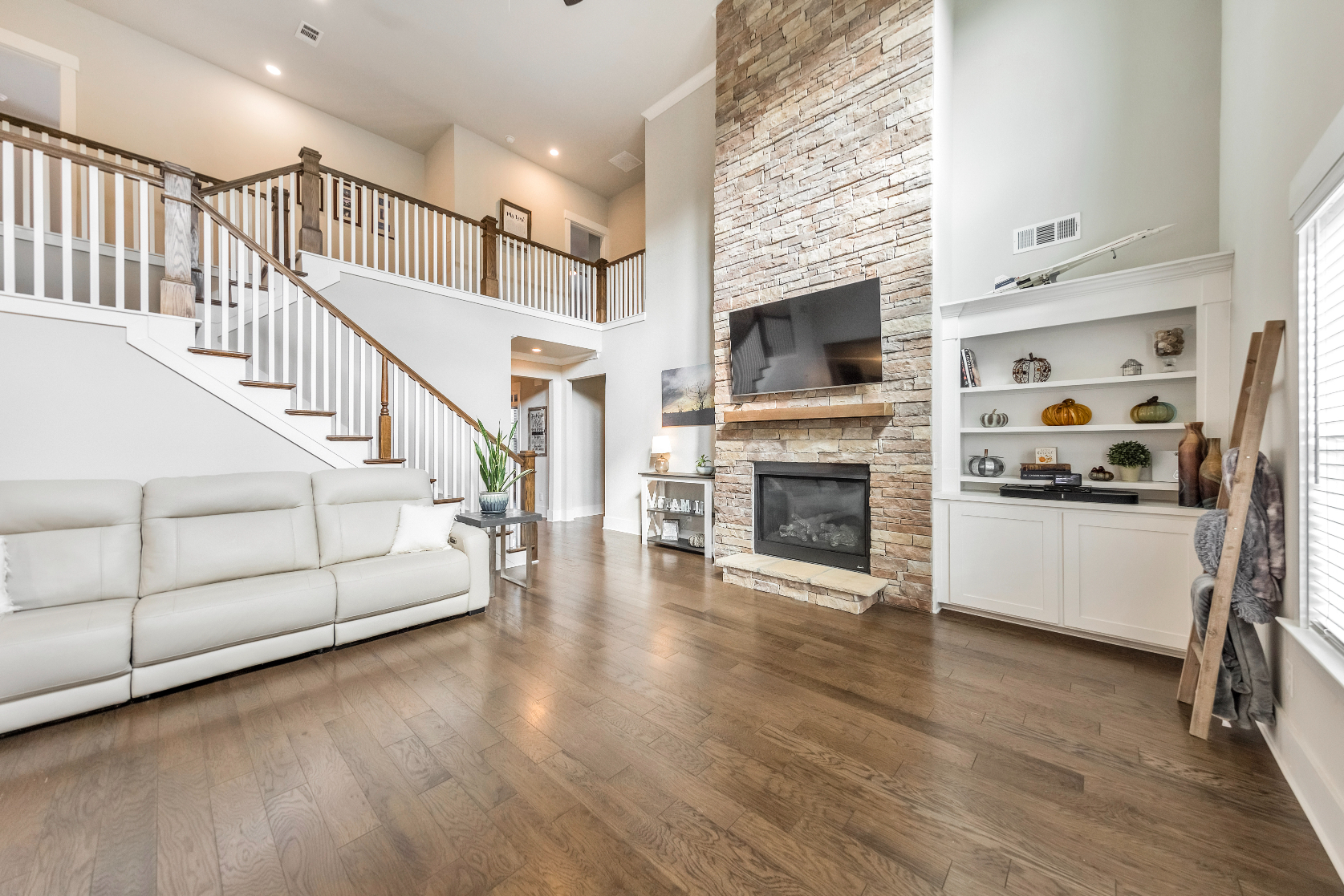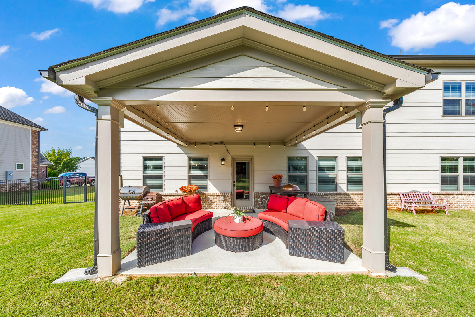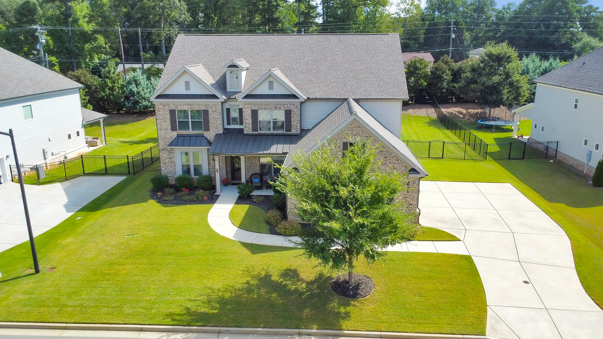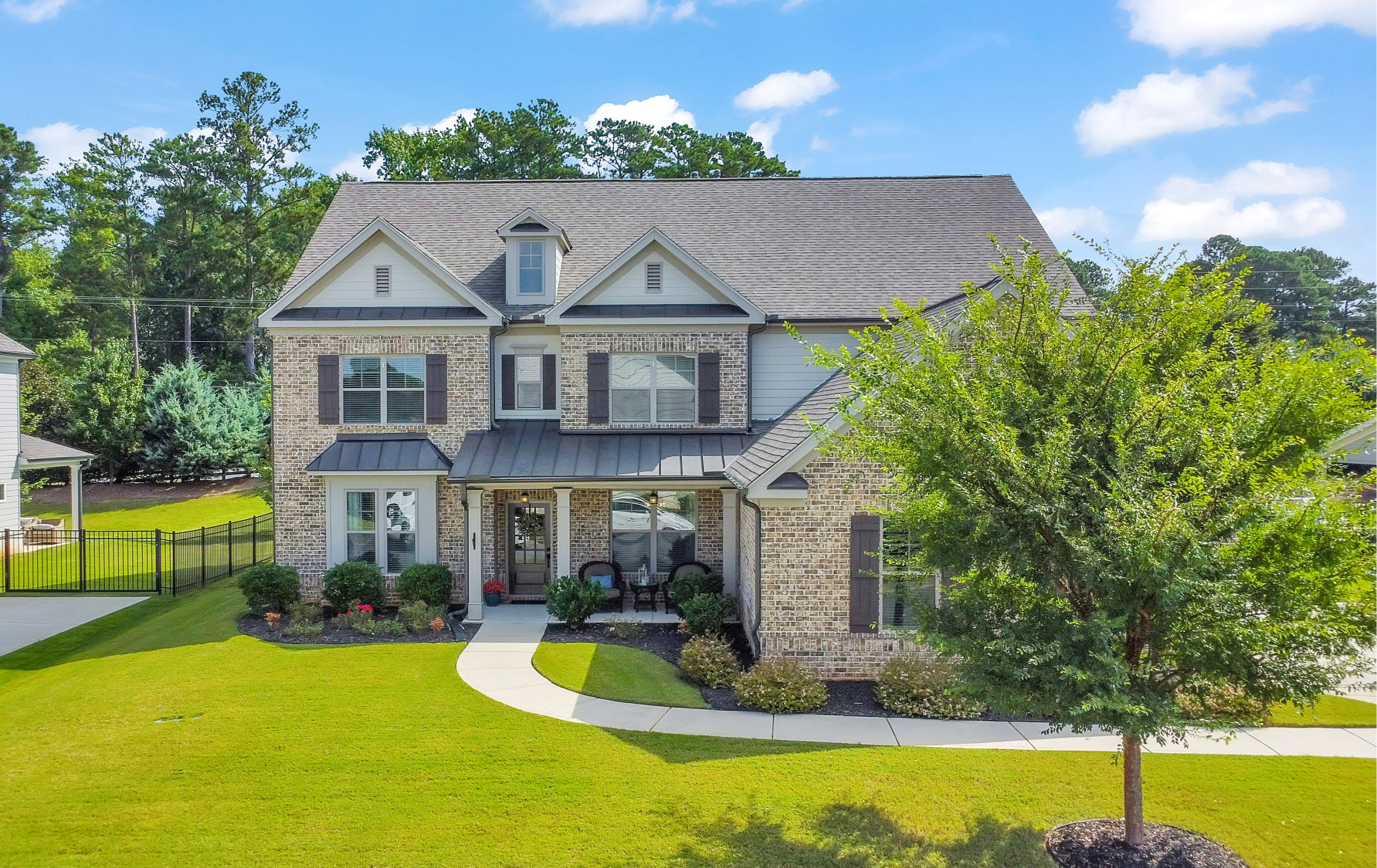 This timeless beauty is ready for you to move right in! Welcome to this stunning 5 bed / 4.5 home built in 2019 that blends modern comfort with elegant design. From the moment you step inside, the open floor plan creates a bright and inviting atmosphere, perfectly suited for both everyday living and entertaining. The gourmet kitchen is a chef’s dream, complete with double ovens, a gas cooktop, vent hood, granite countertops, stainless steel appliances, and white soft-close cabinetry that offers both style and functionality. A breakfast bar and eat-in dining space overlook the two-story great room, where a floor-to-ceiling stone fireplace and a wall of windows flood the home with natural light. The main level also features a formal dining room ideal for hosting dinner parties, a private office with French doors for working from home, and a guest suite with a full ensuite bath. A powder room adds convenience for guests, while detailed trim and thoughtful finishes elevate the character throughout. Hardwood floors extend across the main living areas. Upstairs, the primary suite serves as a true retreat with tray ceilings and a spa-like bath that includes a double vanity, soaking tub, a separate glass-enclosed shower, and an oversized walk-in closet.Secondary bedrooms include a Jack & Jill bath shared between two rooms and an additional bedroom with its own ensuite bath. The laundry room is also conveniently located on the upper level. All bathrooms feature granite countertops and timeless tile finishes. Step outside to the covered patio, the perfect outdoor oasis for relaxing or watching sunsets with family and friends. The three-car garage provides ample parking and storage. This home is nestled in a beautiful neighborhood that offers a scenic lake with a path, providing a peaceful backdrop for evening strolls. Located within award-winning school districts, this home combines luxury living, modern convenience, and an unbeatable setting. Don’t miss the opportunity to make this exceptional property your own.
